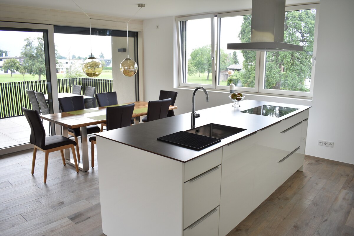 Oko 110 m² veliki stan sa tri spavaće sobe za maksimalno 6 osoba koji se nalazi na prvom spratu malog stambenog kompleksa (izgrađenog 2018. godine) sa samo ukupno 5 jedinica. Ima prostranu terasu i lift. Do željezničke stanice Lake Constance i Lochau ima oko 500 metara. Do supermarketa možete doći pješice za jedan minut. Lochau se nalazi na centralnoj lokaciji između kulturnog grada Bregenca, ostrvskog grada Lindau i Pfänder (lokalne planine).