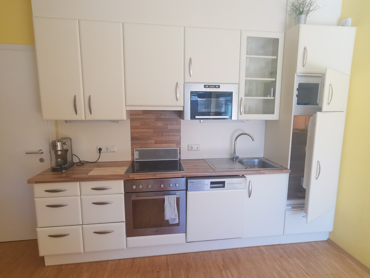 Novi STAN U PRELEPOM Vienertor centru na 1. spratu u blizini STARE GRADSKE LOKACIJE. Sve je lako doći do Supermarketa odmah pored. Pogodno za dve odrasle osobe ili dve odrasle osobe i dete. Ovaj lep stan ima dnevni boravak od 38 m² i terasu od 17 m². Potpuno opremljen dnevni boravak / spavaća soba sa kvalitetnim nameštajem i potpuno opremljenom kuhinjom, Nespresso aparat, TV 55 ", brzi Wi-Fi itd. Prostrano kupatilo sa mašinom za pranje veša, tušem. Parking je besplatan u zgradi, parkiranje bicikala ispod poklopca.