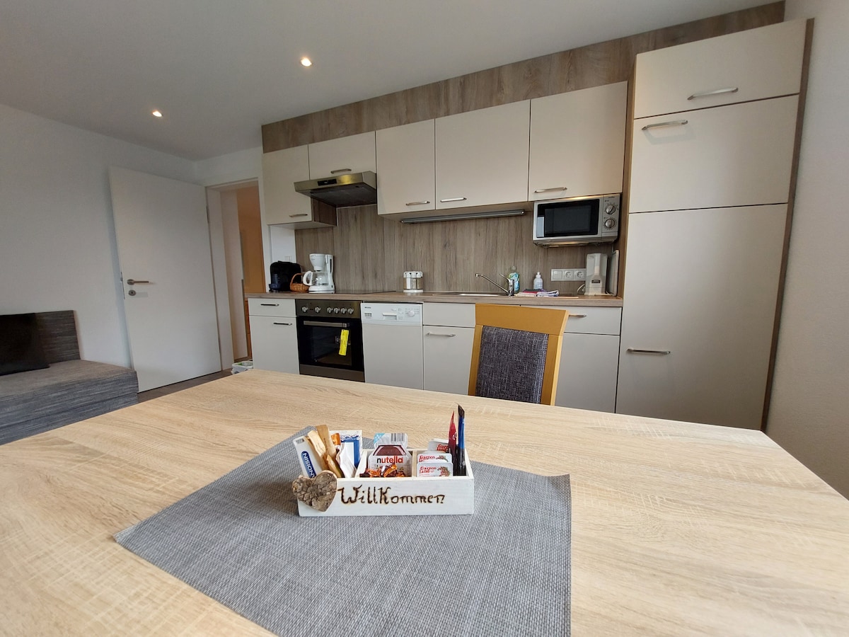 Stan površine 62 m2 je prilagođen osobama u invalidskim kolicima na prvom spratu, sa zasebnim ulazom i nudi prostor za 5 osoba. AM BACH - KUHINJA ZA REKREACIJU - ESS-WOHNRAUM _ Osnovni začini, ulje, sirće _ Nespresso mašina _ Aparat za filter za kafu_ Mašina za sudove _TV _Sofa SPAVAĆA SOBA _MALA SOBA Bračni krevet - Mogućnost spavanja za jednu osobu PRIVATNA BAŠTA _ DEČIJE IGRALIŠTE GARTENMÖBEL KUPATILO / WC _ Kada sa pravim staklenim zidom tuš-kabine _fen za kosu, sapun i peškiri Veći PARKING ISPRED KUTIJE ZA PARKIRANJE