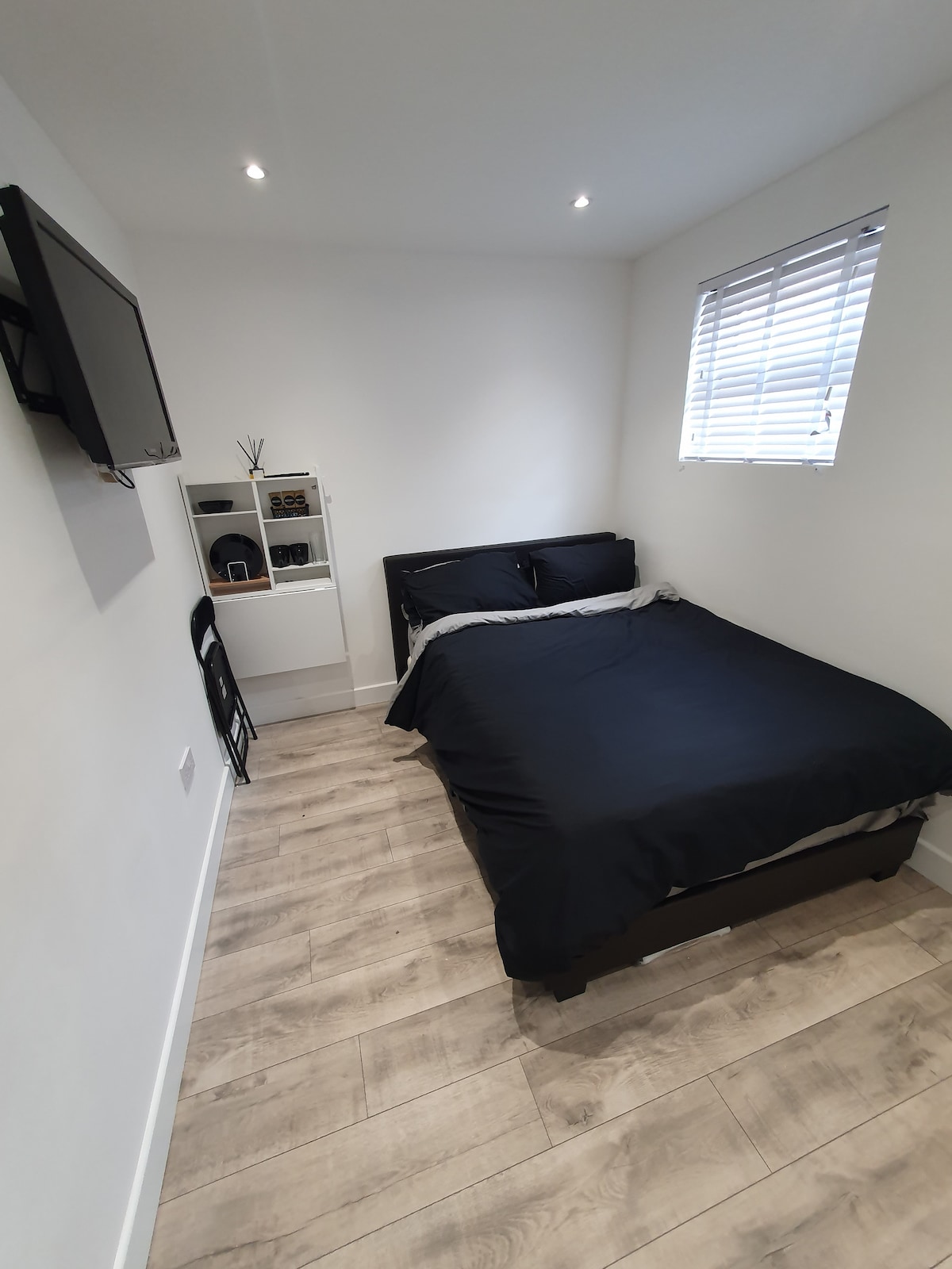 Nedavno preuređena dvostruka garaža u lep, svetao i prozračan stan. Njihova je velika spavaća soba sa susednim WC-om, tušem i umivaonikom za ruke. To je prostran prostor za sedenje u kuhinji opremljen malim TV-om sa puno besplatnih kanala. električna rerna, plinska ploča, mikrotalasna rerna, kuvalo za vodu, toster i frižider sa malim zamrzivačem. Šoljice sa tanjirima, pribor za jelo, čaše, lonci i tiganji itd. Obezbeđena je i daska za peglu i dasku za peglu. Kuhinja ima bar za doručak/laptop i stolice i Settee. Veoma smo zadovoljni ovom divnom konverzijom i nadamo se da ćete i vi biti. Obezbeđen je parking van ulice za jedan auto i sopstveni privatni bezbedan pristup stanu. Nalazimo se u mirnom stambenom naselju, ali dovoljno blizu mnoštva prodavnica, restorana i pabova itd. Sa brzim i jednostavnim pristupom A13 i M25