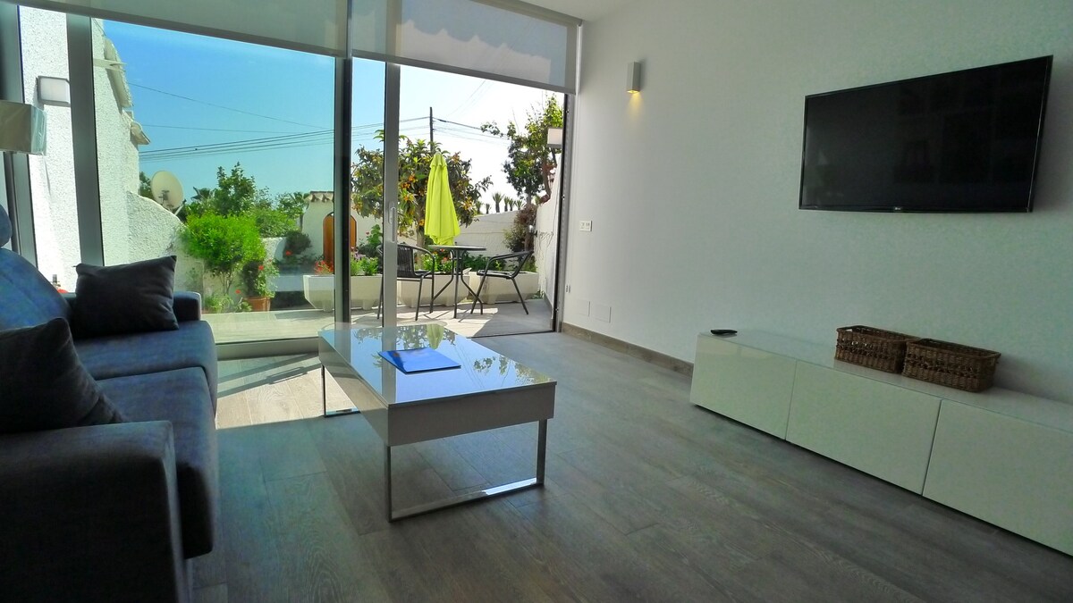 Prelep stan potpuno renoviran od visokokvalitetnog materijala, koji se nalazi u ekskluzivnom urbanom okruženju. 1,2 km od plaže i centra grada. Tu spadaju kupatilo,potpuno opremljena kuhinja,dnevni boravak (WI-FI i kablovska televizija), terasa i privatna bašta. Potpuno renoviran stan sa luksuznim materijalima, koji se nalazi u ekskluzivnoj urbanizaciji 1,2 km od plaže i centra grada. Kompozicija kupatila, opremljene kuhinje, dnevnog boravka, sa WI-FI MREŽOM i međunarodnim kanalima, kao i terasom i privatnom baštom.
