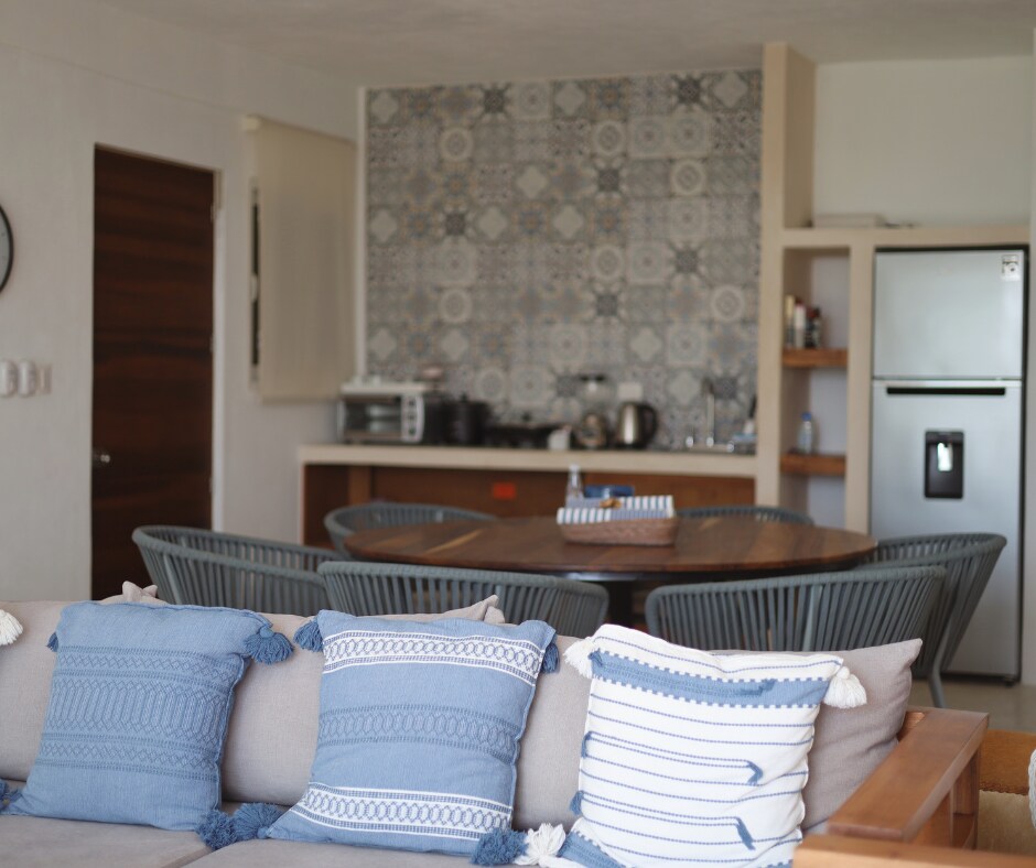 Ancla Mahahual presents Casa Caribe Ocean front condo with swimming pool! We offer 2 bedrooms, 2 bathrooms, living room, dining room and kitchen. The sofas makes into a beds for extra sleeping space if needed. Great location! Within walking distance to all the best restaurants! We offer STARLINK high speed internet. ***We do not provide beach towels***