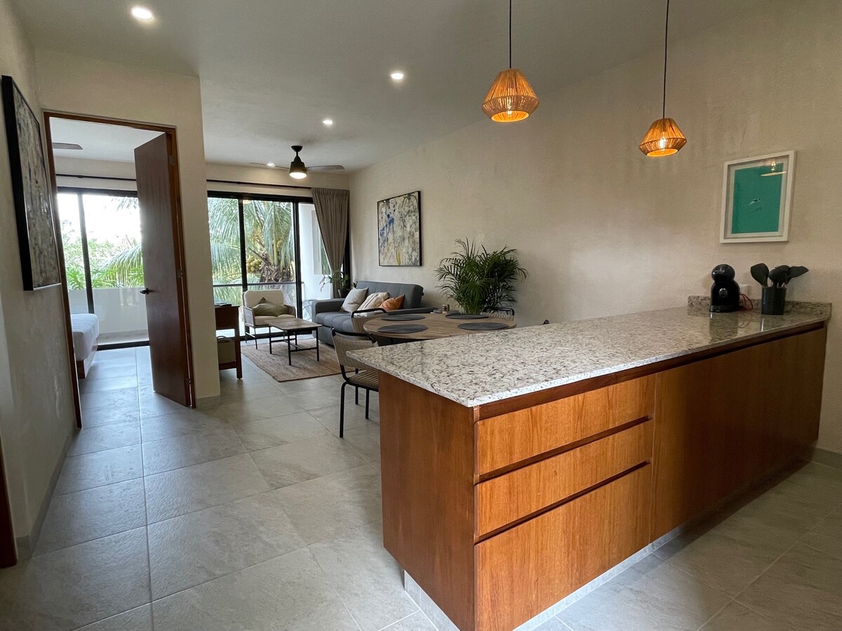 Doživite čaroliju Bakalara u našem prelijepom stanu, potpuno opremljenom i uređenom u tropskom savremenom stilu. 1 spavaća soba sa bračnim krevetom (širine 180–220 cm), dnevna soba sa sofom na razvlačenje, privatna terasa, trpezarijski sto, kupatilo sa WC-om, opremljena kuhinja, klima-uređaj, 2 pametna televizora i brzi Wi-Fi. Takođe ćete imati pristup krovu, gdje se nalazi veliki bazen sa spektakularnim pogledom na lagunu i džunglu. Ako imate lagan san, možda ćete čuti neku buku sa obližnjeg puta.