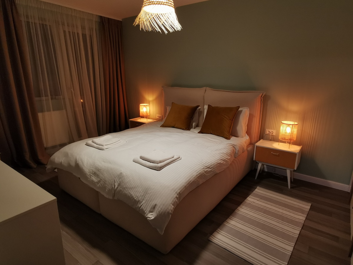 Opustite se u ovom mirnom, elegantnom jednosobnom stanu u ulici Colina Măgurii, Bacău. Uživajte u mirnom snu u udobnoj, zvučno izolovanoj sobi sa izuzetno udobnim bračnim krevetom i ambijentalnom rasvjetom. Imajte na umu da ovaj stan nema TV, a prijem telefona može biti ograničen u zatvorenom prostoru, a veza je dostupna prvenstveno na balkonu. Međutim, imaćete besplatan Wi-Fi, knjige, igre i prenosni retro radio/Bluetooth zvučnik koji se lako povezuje sa vašim telefonom.