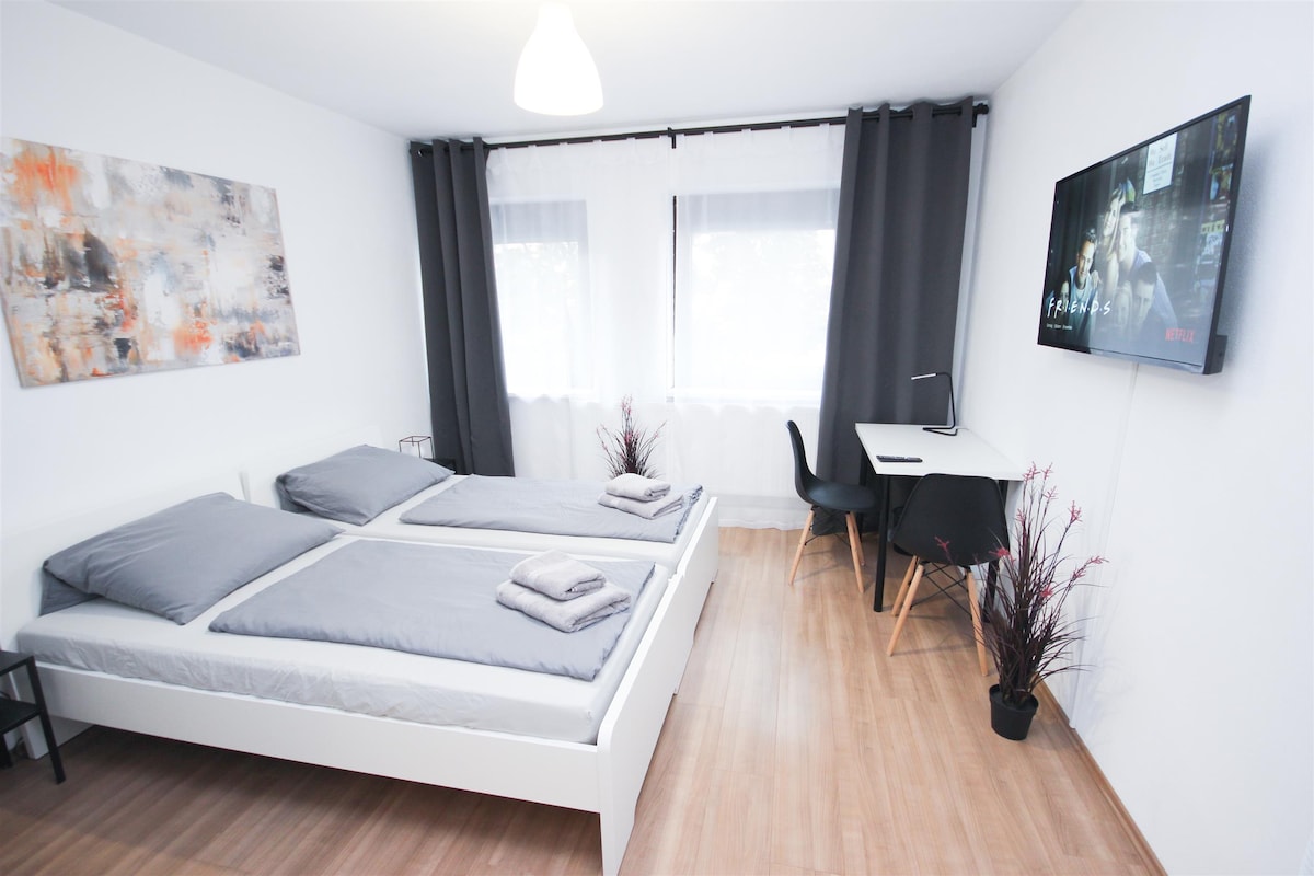 Weekly & monthly stays are especially worthwhile: Stay longer and save — send us an inquiry and secure 20% weekly discount and 40% monthly discount on the current rate. Arrive & feel at home — “This is exactly it!” That’s what we love to hear. The apartment is fully equipped, from a Nespresso machine to a washing machine. Public transport is within walking distance: the city centre, trade fair and airport are quickly reachable. Shops, bakeries and restaurants are nearby.