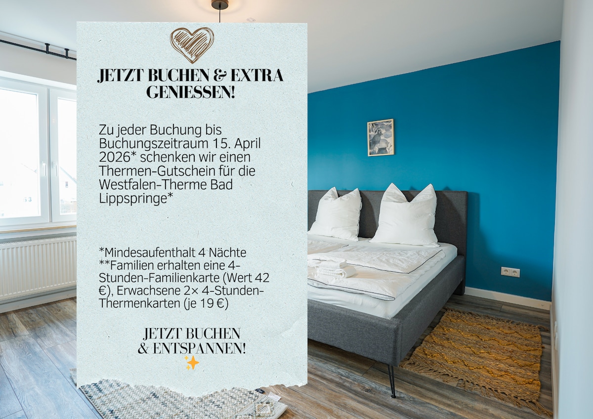 Živećete u kući u uvrštenom polu-drvenom ansamblu iz 1774. godine u neposrednoj blizini Detmolda, opremljenoj antikvitetima, bioskopima, sjenicom sa neometanim pogledom na šumu Teutoburg. Kuhinja, infracrvena sauna, udoban dnevni boravak sa rernom i električnim grejanjem. Spavaća soba sa zidovima od gline, druga pod krovom. Bašta ispred kuće za jedinu upotrebu za roštiljanje, igru itd. Deca i kućni ljubimci su dobrodošli. Supermarket 1,1 km, grad 3,5 km. Drvo za ogrev je uključeno