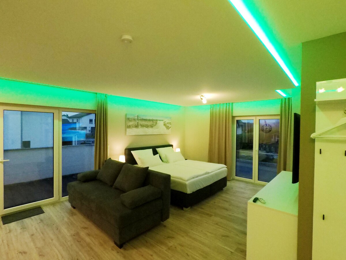 Fantastičan stan na balkonu na odličnoj lokaciji na periferiji u Fuldi. U potpuno novim sadržajima, akcenat je stavljen na najkvalitetniji: Najkvalitetnije led osvetljenje, sve roletne na prozorima, u svakoj sobi, podno grejanje. Vrhunska moderna kuhinja. LED televizor sa ravnim ekranom (Smart TV, 65 inča) Veliki krevet sa oprugama sa prvoklasnim dušecima, uklj. Vrhunski krevet i sofa na razvlačenje.