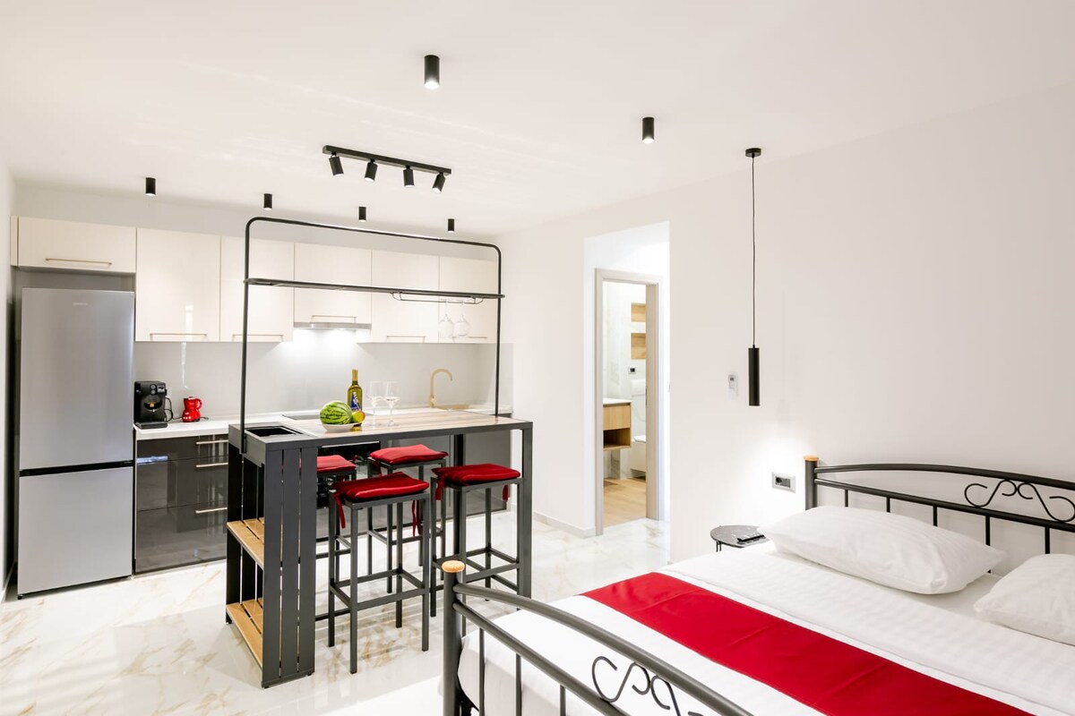 Modern comfort meets historic charm at Studio Nonna. This brand-new, ground-floor retreat features original stone walls and offers rare, stair-free access in the heart of Korčula. Perfectly situated, you are just a 4-5 minute stroll from the ferry port, bus station, and the vibrant Old Town. All within walking distance to the nearest beaches, supermarkets, bakeries, banks, pharmacy, taxi boats, shops, wine and tapas bars, arts venues, historical monuments etc.