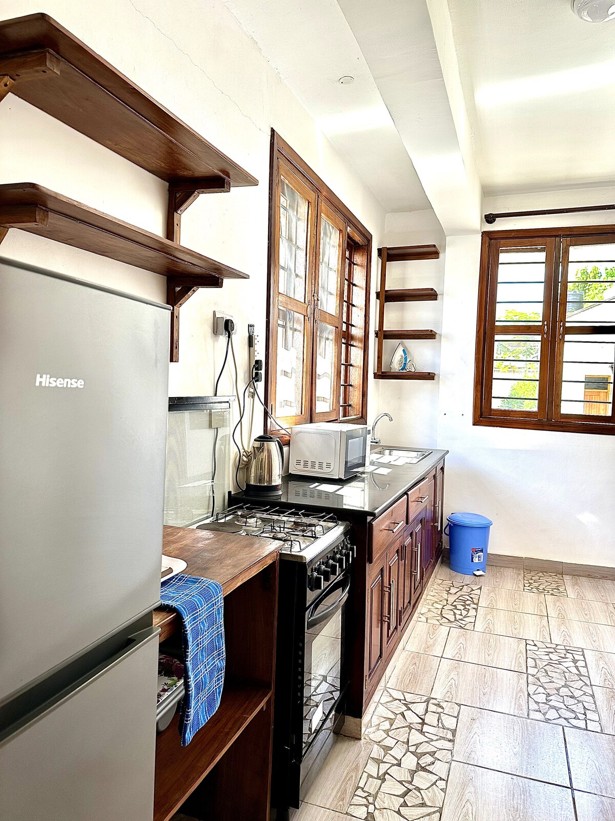Ovoj seoskoj kućici u stilu svahilija pristupa se kroz privatno dvorište u užurbanom starom gradu Bagamojo. U prizemlju se nalaze dobro opremljena kuhinja i toalet u prizemlju, a na prvom spratu je spavaća soba s bračnim krevetom i malim kupatilom. Salon s otvorenim krovom na drugom spratu je divno mjesto za opuštanje i nudi spektakularan pogled na zalazak sunca većinu večeri. Seoska kuća se nalazi na praktičnoj lokaciji, na samo 5 minuta hoda od plaže, popularnih kafića i umjetničkih radnji.
