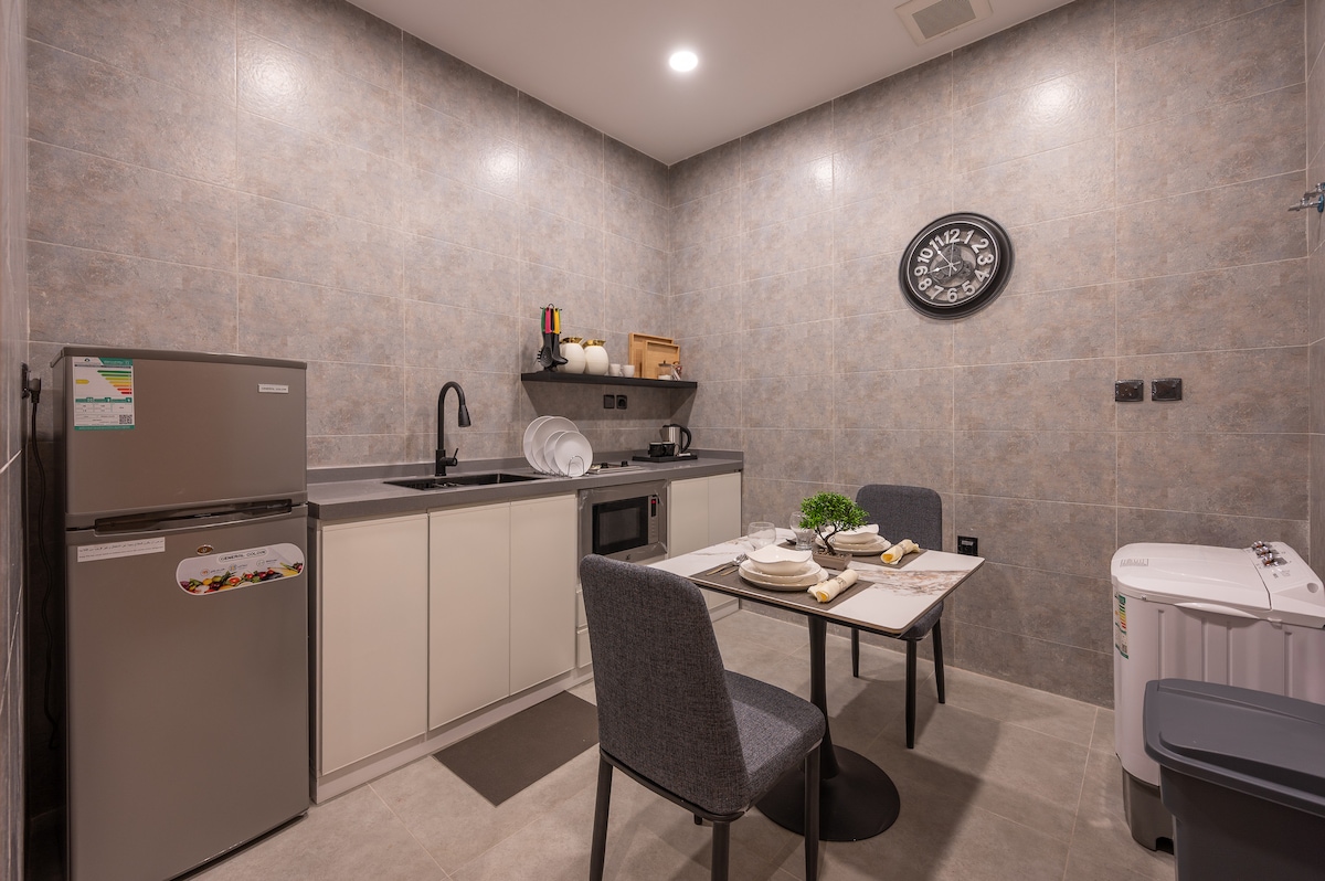 Smješten sa svojom prepoznatljivom lokacijom i u blizini svih vitalnih područja (King Abdulazizou University Dr.Sulaiman Al Habib Hospital, željeznička stanica i dnevne usluge non-stop, ima glavnu spavaću sobu sa privatnim kupatilom i elegantan i udoban salon sa pametnim ekranom sa pristupom internetu, Netflix, VIP i druge aplikacije. U smještaju se nalaze i neke male rekreativne igre. Možete da uživate i u industriji čaja i kafe, kao i u frižideru, stolu za peglanje, stolu za peglanje, karlingu i posebnoj situaciji.