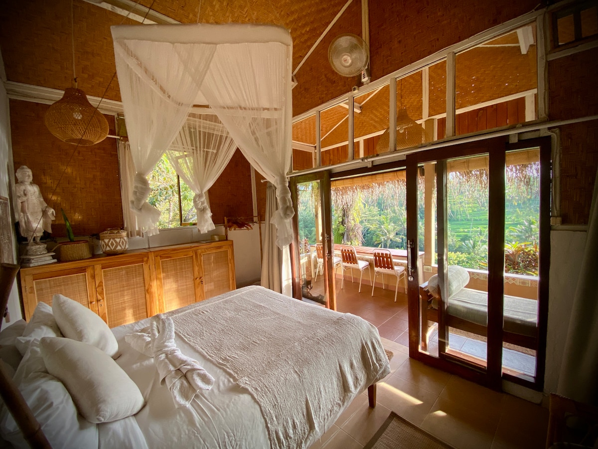 *IMAMO NEVEROVATAN WI-FI I 4 PRELEPA OBJEKTA. KLIKNITE NA MOJ PROFIL DA BISTE VIDELI OSTALE 3 KUĆE U SLUČAJU DA JE OVA ZAUZETA TOKOM ŽELJENIH DATUMA* Smješten na brežuljku u pirinčanim poljima koji gledaju preko doline palmi i terasa od pirinča, a ne na drugoj zgradi na vidiku, nalazi se Rumah Sinara. Uživaćete u neprekidnom pogledu i umirujućem zvuku reke odmah ispod udobnosti kreveta. Imate dovoljno prostora na balkonu da pročitate knjigu , meditirate ili jednostavno sedite i uživate u prirodi.