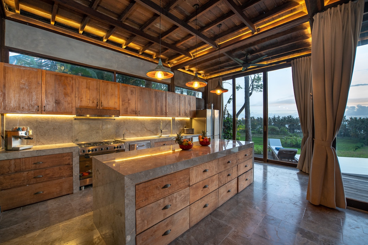 Smještena iznad pirinčanih terasa s pogledom na okean, na samo 3 minuta hoda od netaknute plaže, ova vila s 5 spavaćih soba koju je dizajnirao arhitekta spaja prirodu i modernu udobnost. Uživajte u beskonačnom bazenu, ružičastim zalascima sunca i umirujućim talasima. Uz potpuno opremljenu kuhinju, veliki trpezarijski sto, više zajedničkih prostora, velike bračne krevete, bilijarski sto, igre, 52-inčni SmartTV, Wi-Fi i radne prostore, savršen je za porodice, prijatelje ili odmor. Obroci i masaže u sklopu objekta upotpunjuju vaš odmor u mirnom, autentičnom kutku Balija