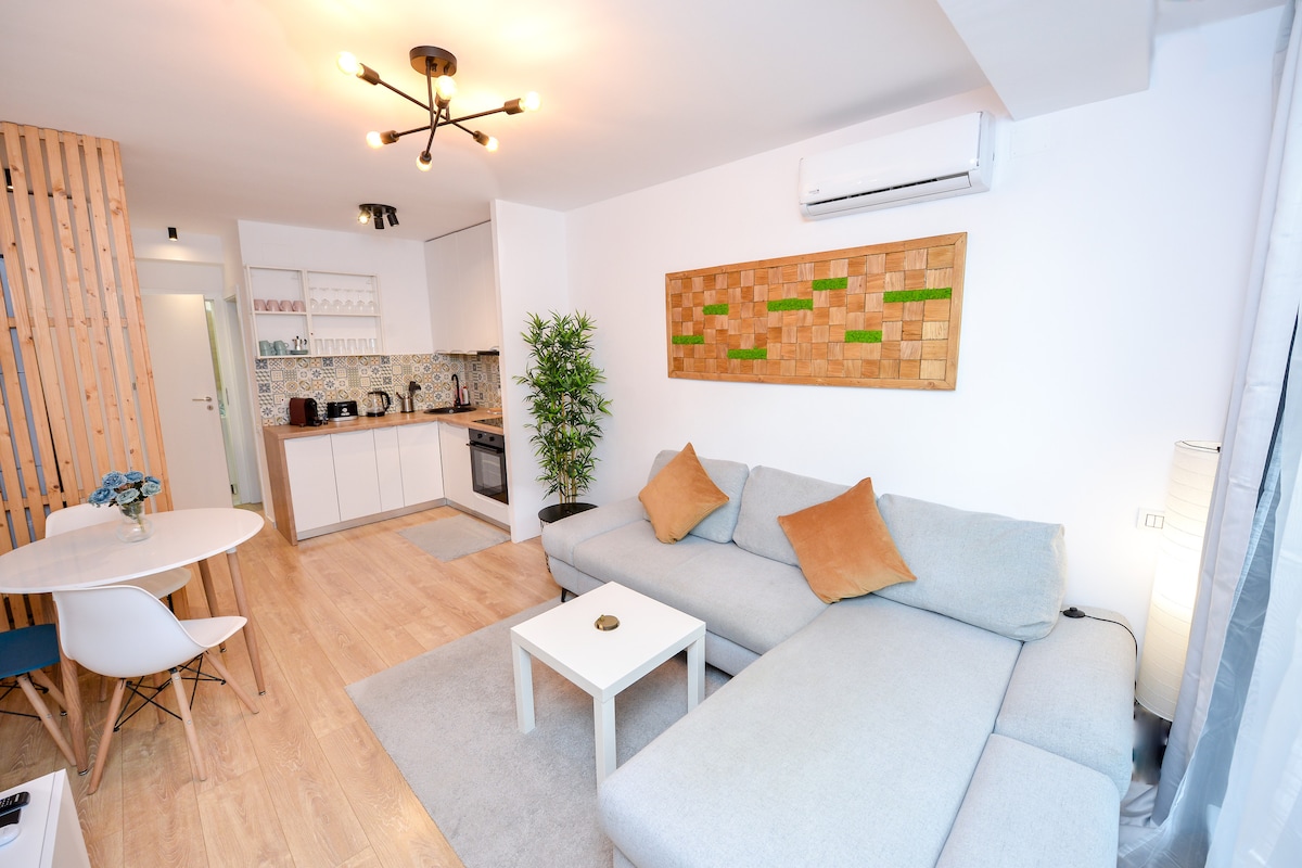 Ovaj moderni stan sa 1 spavaćom sobom nalazi se u severnom delu Bukurešta u rezidenciji Monte Karlo palate. Moderan, elegantan, prostran i svetao, pružiće vam divno iskustvo u Bukureštu, bilo da ste ovde poslovno ili na odmoru. Stan nudi površinu od 60 kvadratnih metara podeljenu na 2 prostora sa otvorenim dnevnim boravkom i spavaćom sobom sa sopstvenim kupatilom.