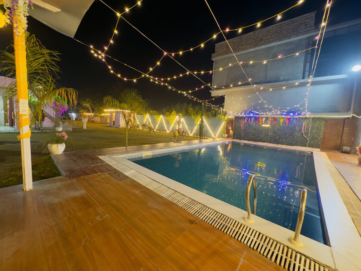 Wake up to greenery, spend your day by a private pool, and unwind under warm evening lights in your peaceful farmhouse in Gurgaon. Designed for staycations, small celebrations, and group getaways, this home offers open space, comfort, and privacy—just minutes from the city. ✔ Private pool with evening lighting ✔ Large lawn for gatherings & games ✔ Indoor living & dining for groups ✔ Ideal for families & small events Perfect for birthdays, weekend escapes, or simply slowing down with your people.