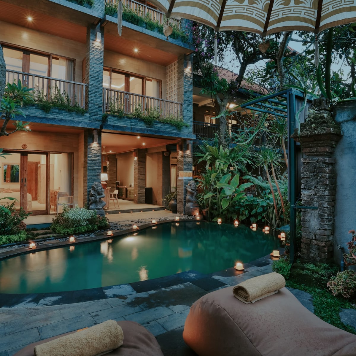 Dobro došli u naše Sacred Resort Tradicionalan doživljaj na Baliju koji nikada nećete zaboraviti i koji ćete uvek hteti da ponovo posetite. FRANGIPANI je luksuzna sa tradicionalnim balijskim karakterom i šarmom. Savršena lokacija; dovoljno blizu da se može prošetati do centra Ubuda, ali dovoljno daleko da uživate u mirnom prirodnom okruženju. Istražite čudesne znamenitosti Ubuda i šire. Od šume majmuna do pijace Ubud i posetite terasu za pirinač, vodopade itd.