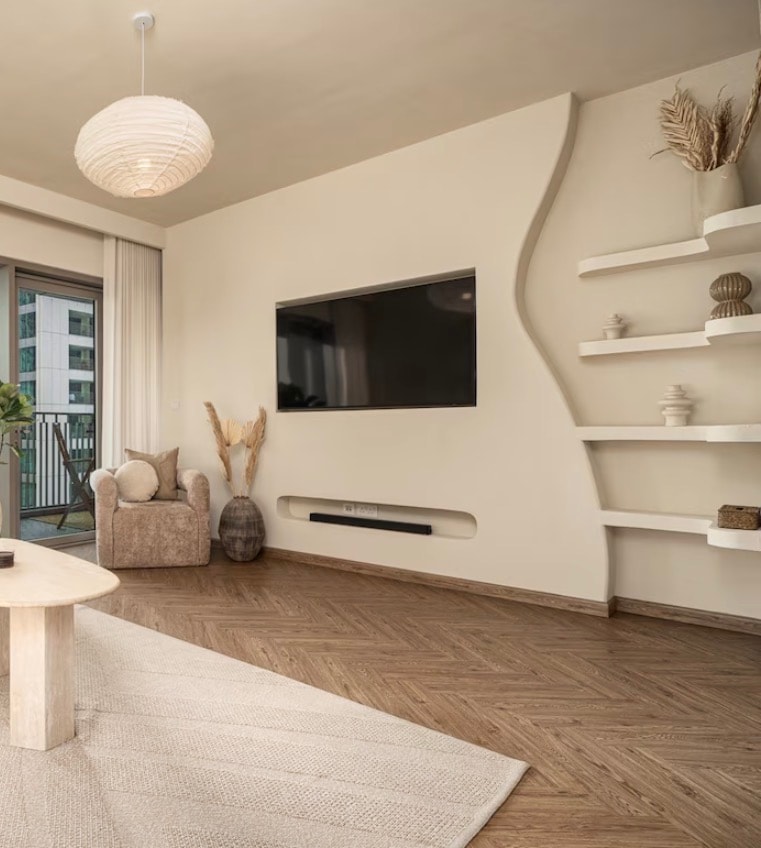 Moderno uređen trosoban stan sa prostranim dnevnim boravkom, otvorenom kuhinjom i balkonom sa pogledom na baštu. Savršeno za udoban boravak u bezbjednom kompleksu.