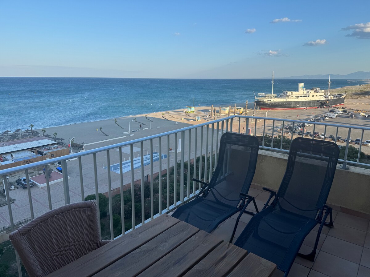 Profitez d’un appartement baigné de lumière avec sa terrasse face à la mer et la plage, sans vis à vis. Appartement 2 pièces d'environ 30 m2, terrasse 10 m2 et place de parking privative. Prestations de confort dans un style moderne et épuré. Il est situé au 2è étage (sans ascenseur) d’une résidence très calme. Le linge est fourni (lit + toilette). Literie de qualité 140x190. 2 TV. WIFI (fibre). Idéal pour 2 personnes