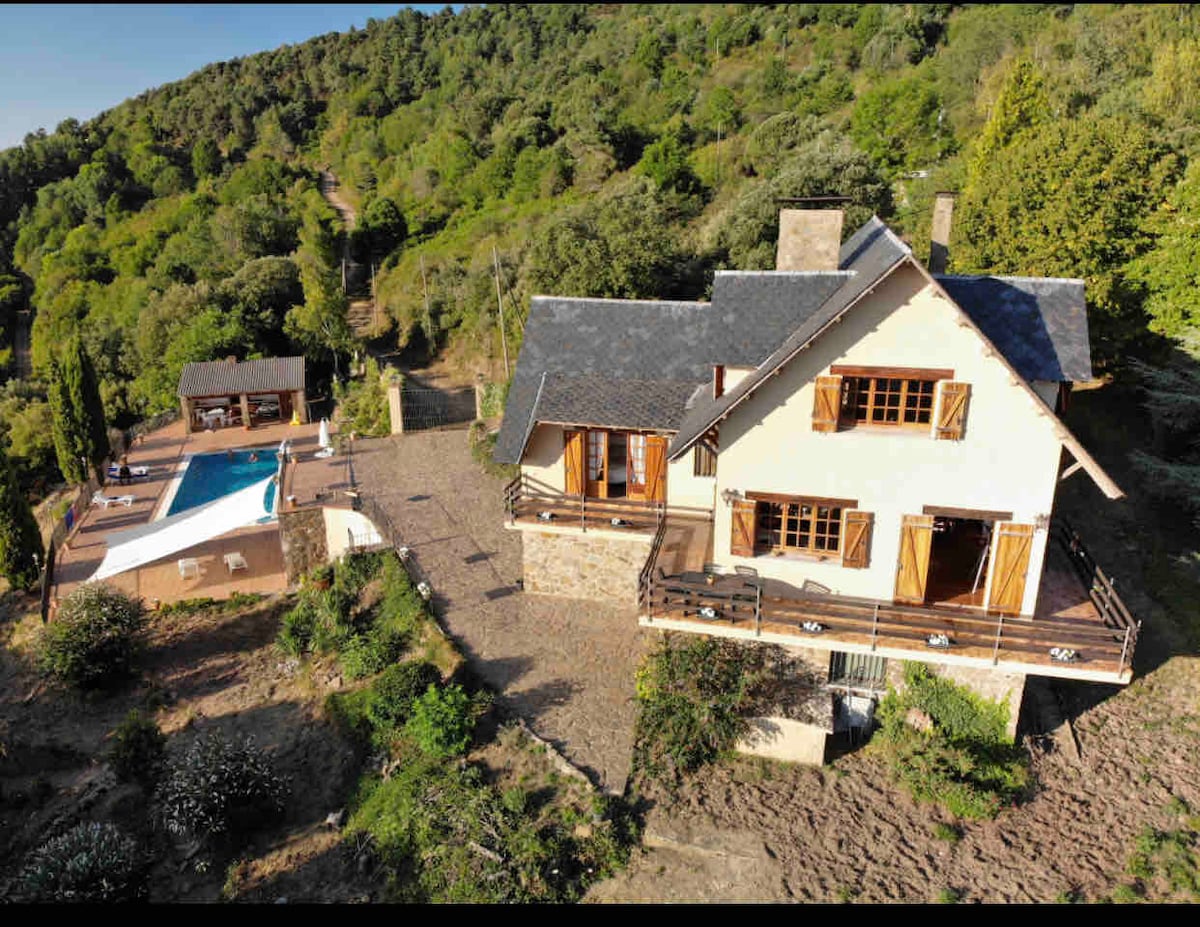 Drvena planinska kuća 150m2, na parceli od 2000 m2 okruženoj šumskom parcelom. Drvena kuća izgrađena 2007. godine na dva sprata i garažom za dva potpuno opremljena automobila. Prekrasan pogled na Pirineje. Sa velikim domom drva za ogrev u otvorenom dnevnom boravku otvoren je za oba sprata. Nalazi se u šumi, sa velikim drvećem, prostorom za roštilj, visećim ležaljkama, drvenom dečijom seoskom kućicom, natkrivenom terasom i velikim igralištima sa travom. Idealno za porodične boravke i koji vole prirodu.
