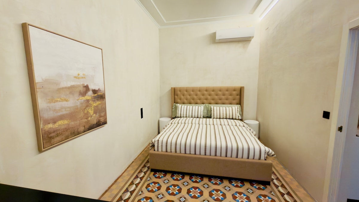 I want to welcome you to one of my new Suites in the center of Barcelona. Around 49 square meters, perfect for couples and solo travelers looking for a unique experience in the most authentic Barcelona, surrounded by the best shops, restaurants. Tourist spots just a few steps away. Enjoy this wonderful space filled with natural light, with a modern and warm decoration that blends harmoniously with the 3-metre-high ceilings and the recently restored original mosaic floors. No lift available