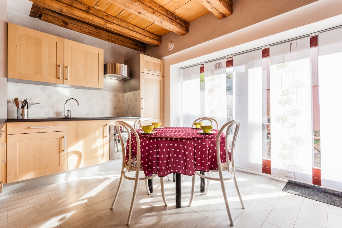 -Etage indépendant dans une maison typique à 650m d'altitude dans un tout petit village. - Le logement est de plein pied mais l'accès se fait par un escalier. - 2 chambres de 1 lit 2 places séparées par un salon/salle à manger/cuisine d'appoint, SDB. Attention, l'une des 2 chambres est traversante (pour aller aux toilettes la nuit...). - Grande terrasse de plein pied à demi-couverte. - Au calme!