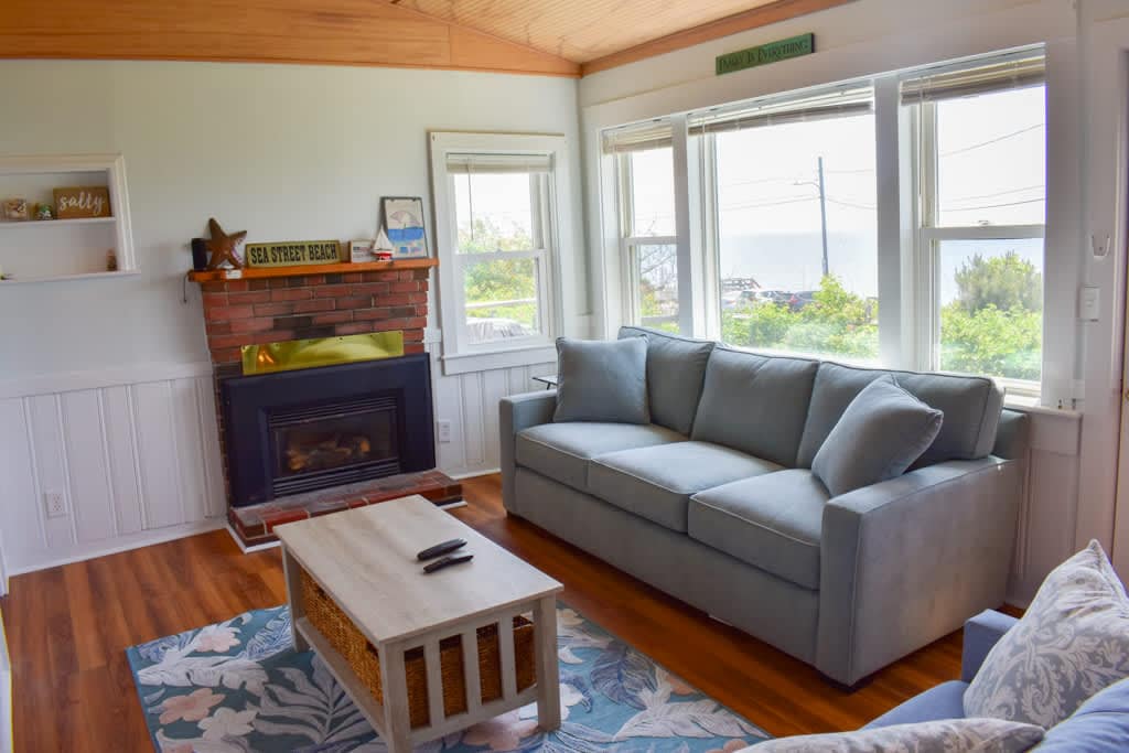 Wake up to beautiful ocean views at this two-bedroom beach home overlooking Sea Street Beach. Just steps from the sand and next to the Pelham House Resort, this inviting getaway sleeps six with a queen bed, two twins, and a queen pull-out sofa. Enjoy a bright living space with a gas fireplace, Smart TVs, a fully equipped kitchen, and a propane grill. Walk to dining, ice cream, and local favorites just moments away.