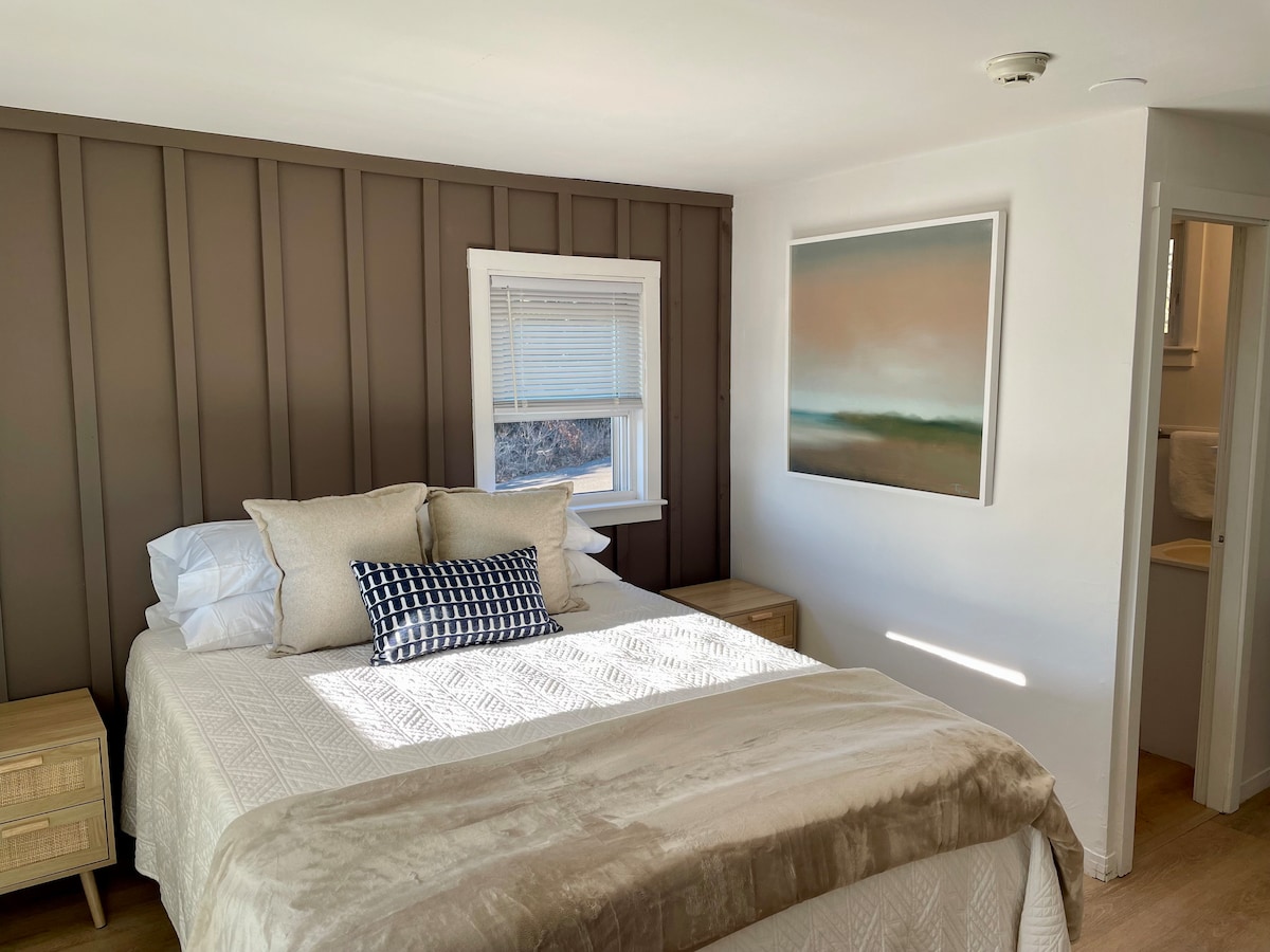 2. sprat. Udoban, savremeni stil sa romantičnom spavaćom sobom sa vrhunskim bračnim krevetom W-Hotel-Mattress. Vrlo popularno među gostima. Kamin, pametni TV/DVD sa ravnim ekranom, pametni TV/DVD, privatni ulaz. Moderno popločano kupatilo ima tuš kabinu veličine 3' x 5' sa kišnim tušem. Maksimalna popunjenost: 2 osobe 195 kvadratnih stopa.
