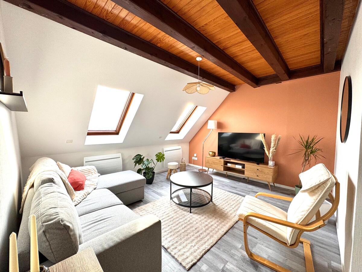 Uživajte u romantičnom odmoru u našem šarmantnom potkrovlju sa 4 zvjezdice u srcu Bara, smještenom u dvorištu alzaške kuće od pola drveta iz 18. vijeka. Ovo prostrano i potpuno opremljeno utočište nudi kuhinju otvorenog tipa, udoban dnevni boravak, bračni krevet, tuš-kabinu u ravnini poda, odvojeni toalet, garderobu, klima-uređaj i Smart TV. Tandem je dostupan za dvoje, kao i stanica za punjenje e-bicikala i privatna garaža. Jedinstven, prefinjen i prijatan smještaj za zaista poseban boravak.