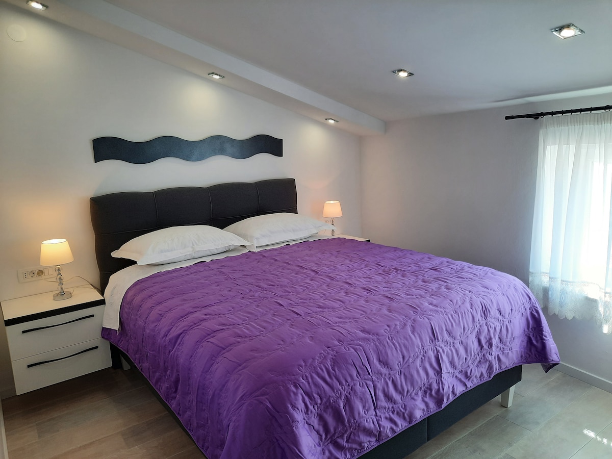 Novi stan sa predivnim pogledom na more i odmah pored plaže. Kuća se nalazi izvan grada u mirnom komšiluku, između borova i biljaka. To je odlično mesto ako želite da se opustite, uživate u plaži, suncu i svežem vazduhu. Slobodno koristite tradicionalni kameni roštilj za pripremu ribe koji možete dobiti od lokalnih ribara. Uživajte u obroku na balkonu sa prirodnom borovom hladovinom. Možete povremeno da doživite čuveni vetar Bura koji čini naše more čistim i ima dokazane prednosti za disanje.