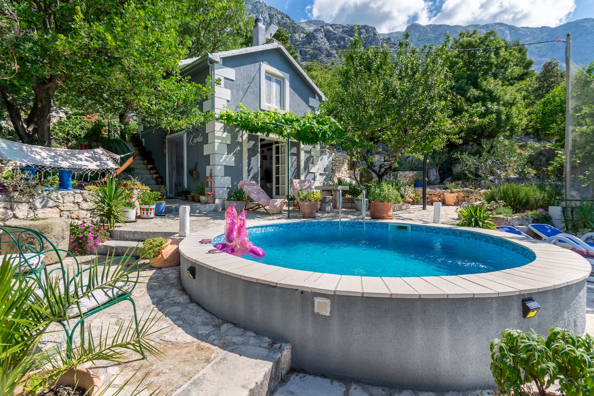 Nemojte ovo iznajmljivati ako ne želite mir i tišinu. Zatvorite oči i zamislite: autentično staro selo, samo nekoliko ljudi živi, kamene kuće, zvuk cvrčaka, netaknuta priroda, pogled na Jadransko more i ostrva, planinu Biokovo, borove i masline, mediteranski osjećaj. Napunili smo kuću toplinom i pozitivnom energijom, ali nemamo bazen ili đakuzi, imamo nešto bolje - jadransko more, udaljeno samo 2 km. Kuća se nalazi iznad Baške Vode - 2 minuta automobilom,na nogama planine Biokovo sa zadivljujućim pogledom.