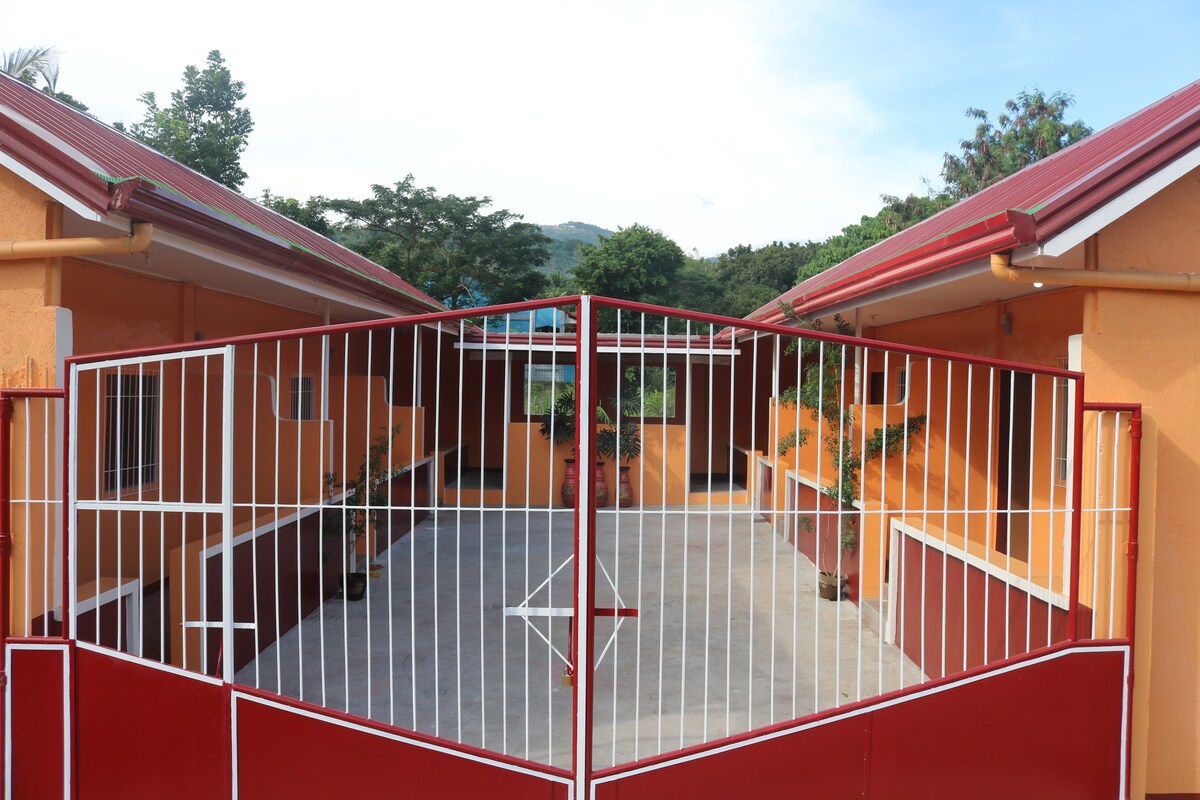 Vaša mini kuća. Spavaća soba sa klima-uređajem za 10. 2 dvokrevetne terase sa 4 bračna kreveta i 2 kreveta. Odlično za porodične trenutke zbližavanja ili izlete u barkadu. Sa spojenim tušem i cr. Trpezarija i čajna kuhinja sa šporetom na butan (1 besplatna kanta za butan), roštiljem, šporetom za pirinač, nekim osnovnim tiganjima i kuhinjskim alatima, električnim kuvalom, sudom i 1 bokalom vode (5 galona) Bazen je udaljen nekoliko koraka, dok je plaža udaljena 3 minute hoda sa suncobranima, stolovima i stolicama za vašu upotrebu.