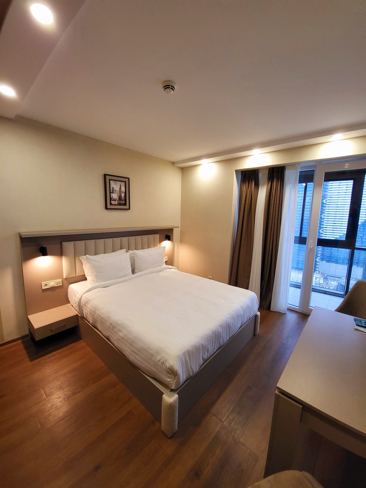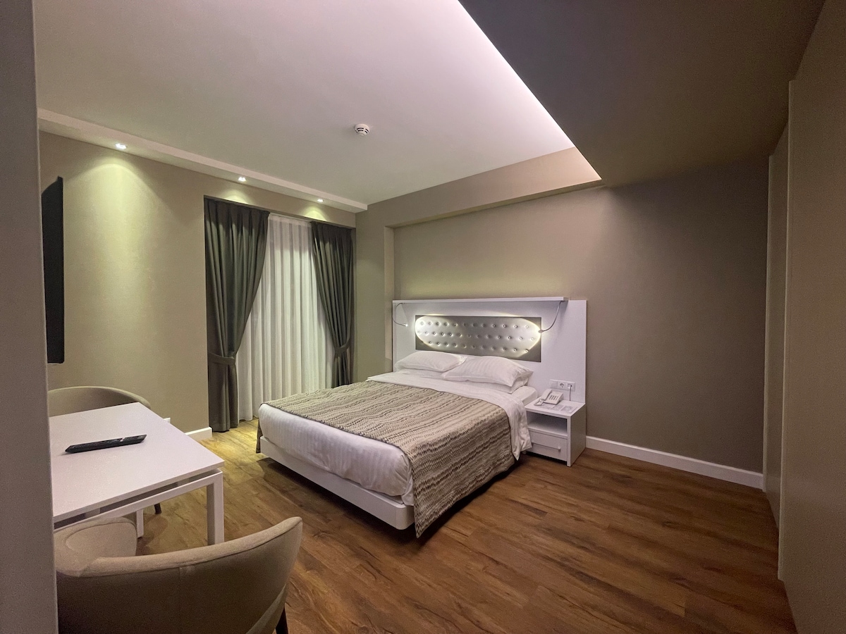 Novi stan u prvom redu do mora u hotelu AQUA & Apartments Batumi. Nalazi se na 14. spratu sa prelijepim pogledom na more. Ima veliku spavaću sobu sa velikim krevetom i malu spavaću sobu sa krevetom za jednu osobu. Posebno je pogodan za male porodice. Doručak se može dodatno rezervisati za 15 Lari na licu mjesta. Resttaurant će biti spreman krajem maja.