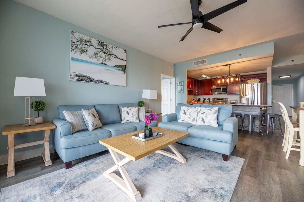 Stan na 16. spratu u zgradi Tidewater sa predivnim pogledom na okean sa balkona. Ovaj raspored sa 2 spavaće sobe + krevet na sprat prima 8 osoba i idealan je za porodice i grupe. Sadrži 3 kupatila, apartman sa velikim bračnim krevetom, spavaću sobu sa francuskim krevetom, krevet na sprat, kauč na razvlačenje, brz Wi-Fi, 70-inčni pametni TV, mašinu za pranje/sušenje veša i potpuno opremljenu kuhinju. Jednostavan pristup plaži, šetnja do parka Pier i pogodnosti odmarališta, uključujući bazene, đakuzije, restorane i Starbucks. Jasne smjernice za prijavu, uključujući savjete za izbjegavanje gužve u liftu.