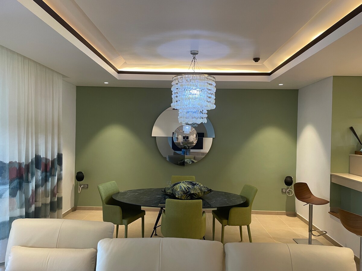 Loue magnifique villa entière dans le domaine d'Anahita avec accès gratuit à 1 belle salle de sport,2 tennis,1 padel payant. Elle offre 600m2 habitable,5 chambres(50m2) avec salle de bain,dressings,WC indépendant,douche extérieure.Immense salon- salle à manger,cuisine,îlotcentral,arrière cuisine,espace dinatoire extérieur,buanderie,2 ch ont un accès direct à la piscine,la plus grande du domaine! Louée avec une femme de ménage 5 j/7 et 2 voiturettes de golf. Au calme absolu,sans vis-à-vis