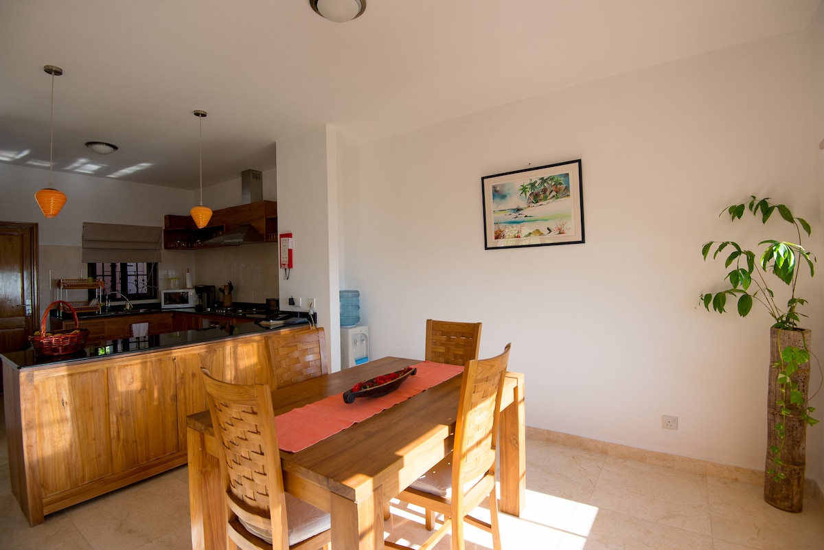 Dvosobna poluspratna vila ima glavnu spavaću sobu sa spojenim kupatilom sa tušem i velikom verandom sa dnevnim krevetom i foteljom sa pogledom na okean i malu privatnu plažu na dnu vrta. Soba za goste ima kupatilo sa tušem i malom verandom. Cela jedinica je okrenuta prema moru i pruža pogled koji oduzima dah sa svih nivoa. Smeštaj pokriva 107.30 kvadratnih metara i idealan je za 4 osobe, 4 odrasle osobe ili 2 odrasle osobe i 2 dece. Nedavni dodatak je bazen.