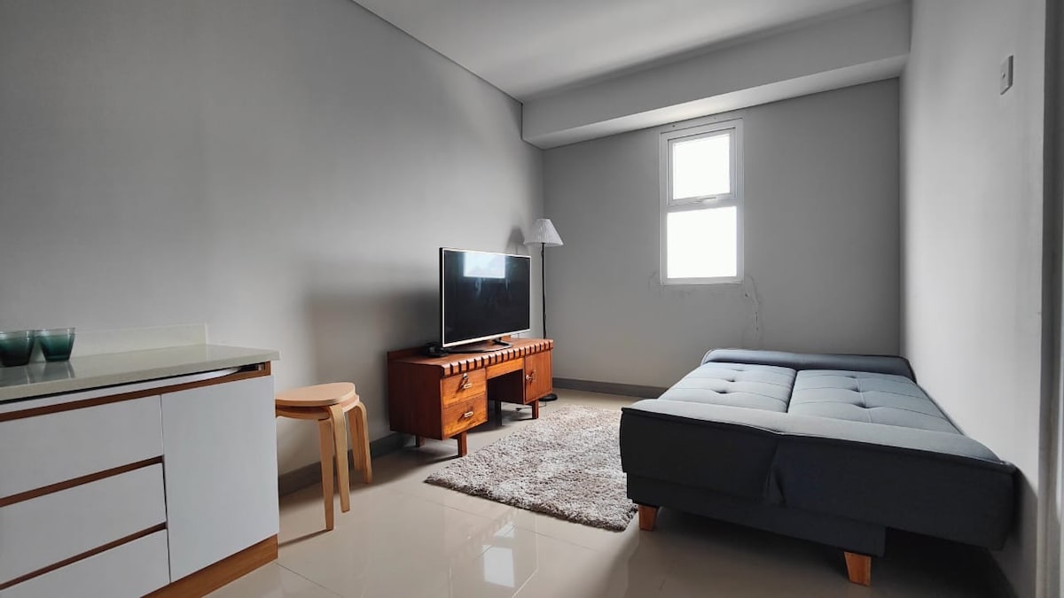 Modern Studio with Amenities & Mall Access in Depok Experience comfort and convenience in this cozy studio apartment, perfect for business or leisure. Equipped with essentials like a TV, high-speed WiFi, refrigerator, and water dispenser, it also boasts a scenic view for a relaxing stay. You can also enjoy the apartment's swimming pool. Note: albeit we DON'T provide water heater for shower, the water temperature here is generally comfortable 😊