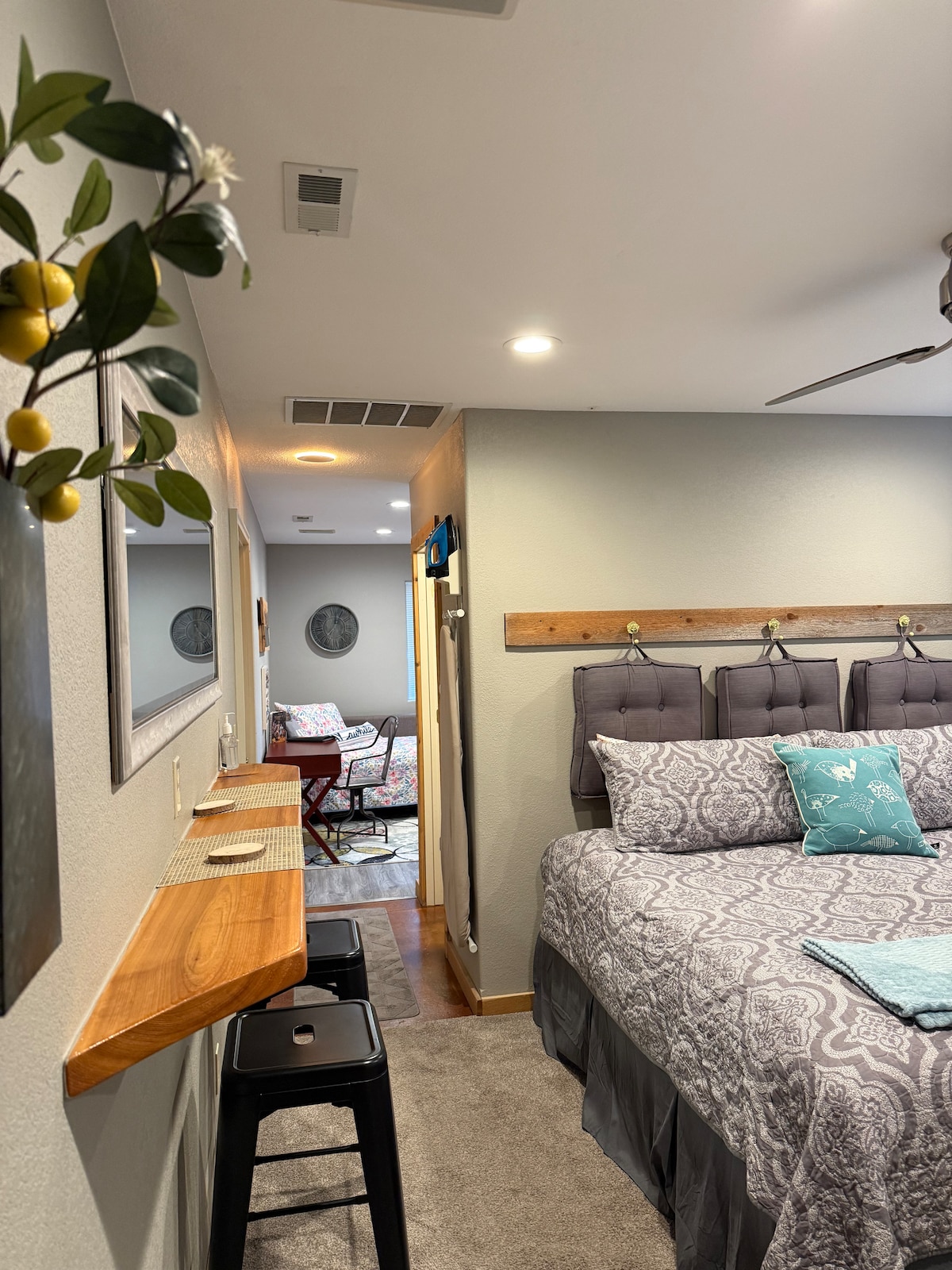 Single family home NE, quiet safe cul-de-sac, 3rd Lawrence Ct. N. 13., sa parkingom van ulice Privatni ulaz dobro osvijetljen u odvojenim prostorijama sa velikom spavaćom sobom, komodom, stočićem, bračnim krevetom u Kaliforniji. Dnevna soba sa sofom i ljubavnim sedištem i pametnim televizorom od 50inča, potpuno opremljena kuhinja. Očistite susjedstvo s policijskim službenikom i vatrogascem. Velika terasa za posmatranje ptica pesama sa pogledom na jezero sa vodopadom, cveće zatvoreno ogradom za privatnost od 10'za opuštanje. U blizini univerziteta države Vičita.