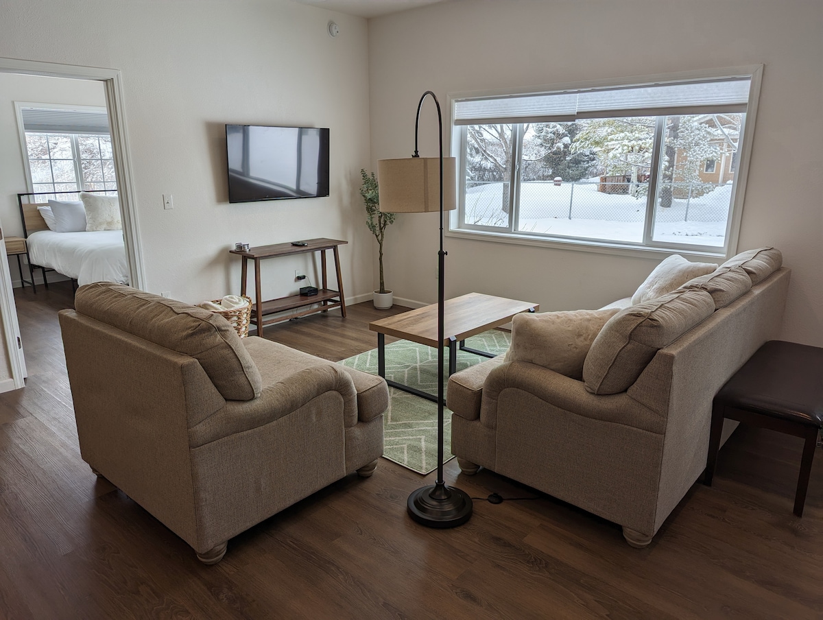 Uživajte u elegantnom iskustvu u ovom smeštaju koji se nalazi u centru grada. Privlačan studio u tri kompleksa sa privatnim ulazom i garažom za jedan automobil. Fantastičan pogled na planinski lanac Bridger. Prostrano zadnje dvorište. Bračni krevet, udoban kauč na razvlačenje, puna kuhinja, mašina za pranje i sušenje veša. Deca se pakuju i igraju i stolica za hranjenje su na raspolaganju. Futon u prizemlju. Uđite kroz garažu ili privatne stepenice. 3 milje od aerodroma Bozeman, 90 milja od YNP-a, 45 minuta do Big Sky, 30 minuta do Bridger Bowla. ZABRANJENO PUŠENJE, BEZ KUĆNIH LJUBIMACA.