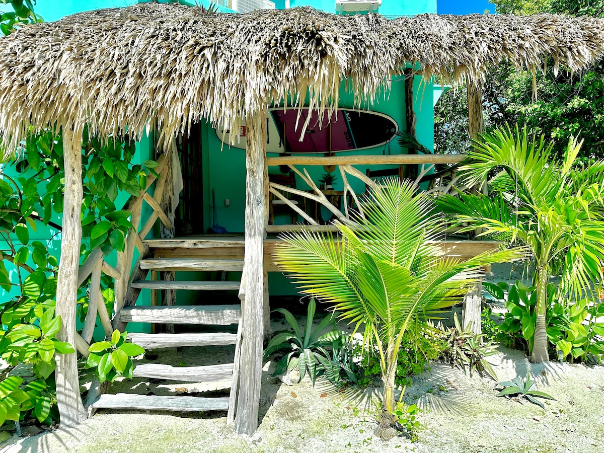 New secluded beach front property with 4 ensuite studio queen rooms on the northwest side of Caye Caulker. Just 1 mile north of The Split by foot or bike, or a 5-10 min boat ride if you prefer to arrange direct transportation to the property! This listing is for unit #2 but see additional links for other rooms or the whole property, which sleeps up to 8! Kayaks, paddle boards, bikes & hammocks provided, plus an open-air shared palapa kitchen with bbq for grilling up your catch of the day!