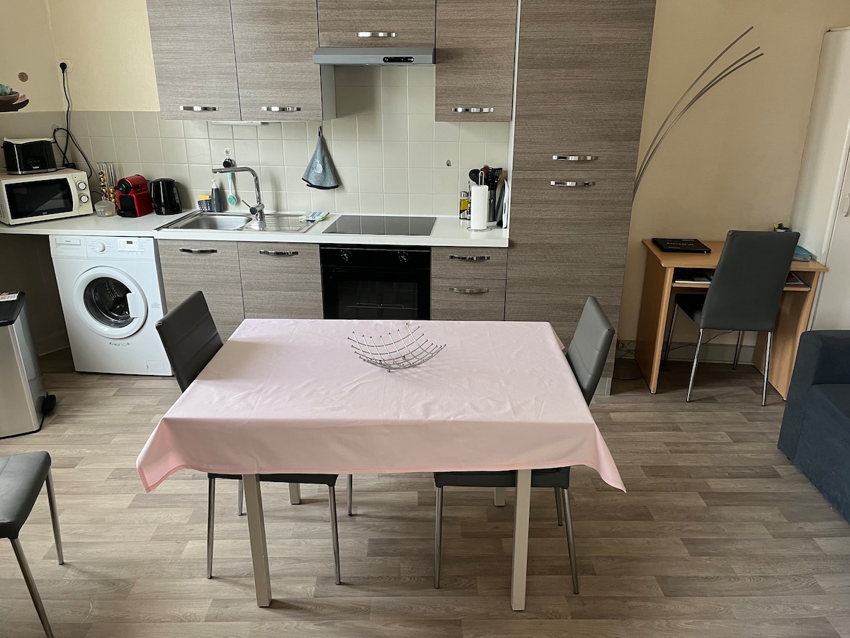 Studio se nalazi na 2 minuta hoda do centra grada Oyonnax-a, 1 sat od Liona, Ansija i Ženeve. stan je opremljen: - 1 bračni krevet 140x190 - 1 sofa (veličina kreveta 120 x 190) - 1 opremljena kuhinja (rerna, keramički šporet, mikrotalasna rerna, frižider i zamrzivač, tiganj, šporet, šporet, tanjiri, pribor za jelo, činije...) - 1 kupatilo sa tuš kabinom i WC šoljom - 1 TV - Besplatan Wi-Fi - Posteljina i peškiri (obezbeđeno) - besplatno privatno parkiralište