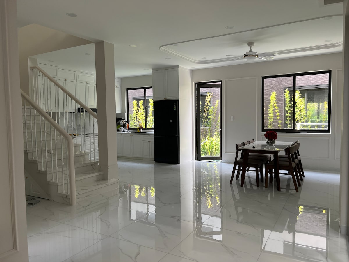 Biệt thự dt 150m2, 2 tầng gồm 3PN, Phòng khách, bếp ăn, 3 mặt sân vườn. Biệt thự sang trọng, đầy đủ nội thất, trang thiết bị sinh hoạt cho gia đình nhóm bạn, mang đến không gian sống, nghỉ dưỡng thoải mái, đẳng cấp, tiện nghi hiện đại, nằm trong khu đô thị Waterpoint - Khu đô thị có vị trí 3 mặt sông Vàm cỏ, đầy đủ tiện nghi như hồ bơi, phòng gym, công viên vui chơi, sân bóng rổ, pickle ball, tennis…