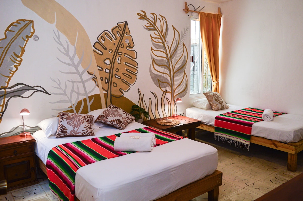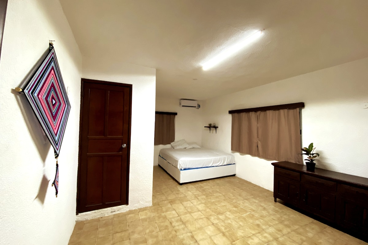 Casa Cielo Cancún is an hostal located downtown Cancún, distance walking to restaurants, local bars, bus stop and the entrance of the hotel zone. Private bedroom with a king size bed, private bathroom, smart tv 55'' and air conditioner. This room is in the second floor. The hostal has a shared pool, full equipped kitchen and dinning room or co-working area with smart tv and A.C. Few minutes to the beach! (By bus/taxi) 1.5 km to bus terminal ADO.