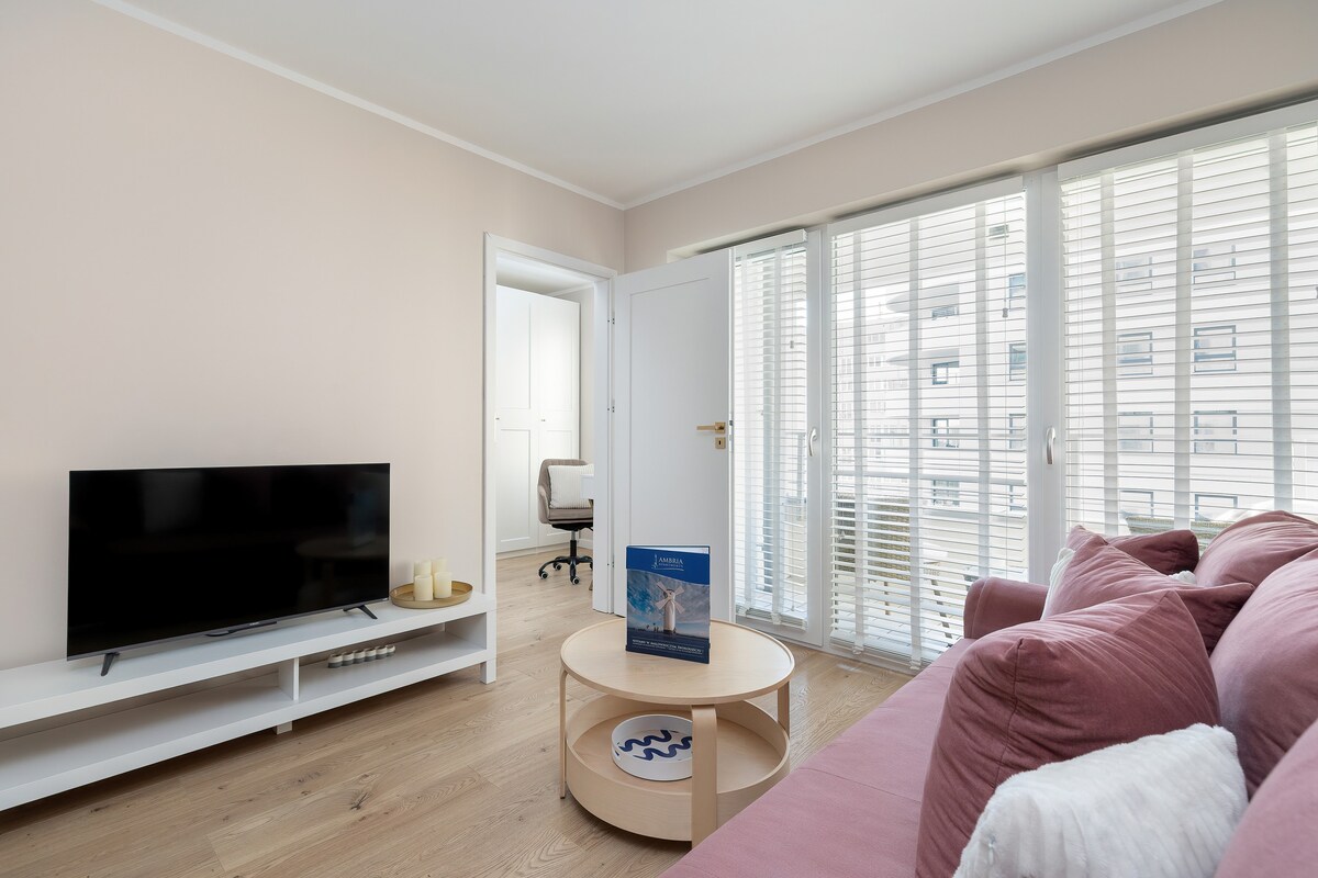 Elegantan i udoban dvosoban stan koji se nalazi u prizemlju stambene zgrade u kompleksu Bałtycka. Stan se sastoji od dnevnog boravka u kombinaciji sa čajnom kuhinjom, spavaće sobe sa bračnim krevetom, garderobom i TV-om i kupatila sa tuš kabinom i WC šoljom. Dnevni boravak ima udoban ugaoni kauč na razvlačenje za 2 osobe, TV i sto sa četiri stolice. Stan ima terasu okrenutu prema jugu, kojoj se može pristupiti i iz dnevne i iz spavaće sobe. Besplatan bežični internet je dostupan u stanu.