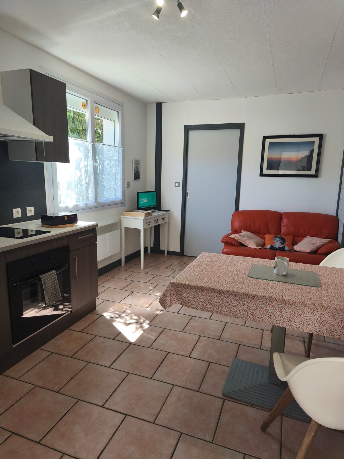 Stan 100% čaura, na drugom spratu male zgrade. Mirna lokacija dok se nalazite u srcu sela, sa dovoljno parkinga koji nije privatan. Udobno gnijezdo od 35 m2 za 4 osobe, toplo i sofisticirano. Terasa od 100 m2 i privatna bašta. Spavanje: 1 spavaća soba sa krevetom dimenzija 140x190 i velikom garderobom, kauč na razvlačenje sa pravim dušekom dimenzija 140x190 Kreveti napravljeni po dolasku. Potpuno opremljena kuhinja. Kupatilo u tuš-kabini, odvojeni WC. Posteljina za kupanje je uključena.