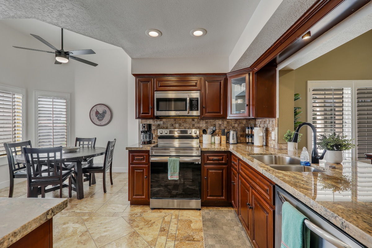 Pobjegnite u svoju privatnu pustinjsku oazu, gdje sunce, palme i miran pogled na golf teren stvaraju savršeno utočište u Indiju. 💦 Bazen sa slanom vodom i besplatno grejanje spa centra 🎮 Igraonica: sto za bilijar, stoni tenis, arkadne igre i smart TV 🛏️ Za 10 osoba: 2 bračna kreveta (širine 180–220 cm), 1 bračni krevet (širine 150–179 cm), bračni krevet (širine 135–179 cm) + krevet na sprat 🍳 Kuhinja za kuvare + bar za kafu 🔥 Ognjište, roštilj, vanjska trpezarija i salon 🎾 Tenis, piklbol i teretana (4 gosta) 🚗 Blizu Indijan Velsa, La Kinte i Džošua Trija