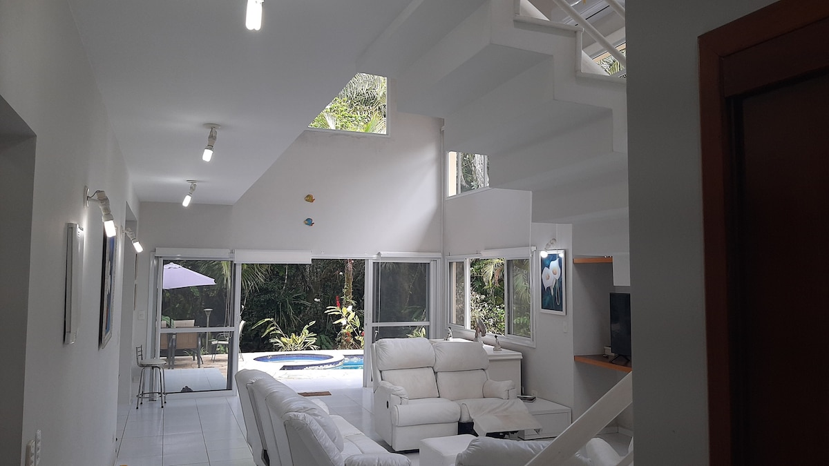 Dobro došli u našu mirnu kuću u šumi, nekoliko minuta od prelijepe Praia Guaratuba i samo 2 sata vožnje od Sao Paula! Iskoristite ovu poluprivatnu plažu, a zatim se povucite u naše šumsko utočište gdje ćete zaspati uz zvukove džungle i daleke talase. Uživajte u roštilju i prelijepom bazenu dok posmatrate kolibrije i drveće uokolo. Naša kuća je u zatvorenom stambenom kompleksu sa 24-časovnim obilascima obezbeđenja. Potpuno je bezbedno.