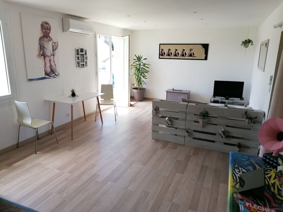 Olakšajte život u ovom mirnom smještaju koji se nalazi u centru grada. Na 1. spratu mini rezidencije, privatan pristup stanu. 200 m od klinike Causse, marine, kanala du Midi i hiper centra. Potpuno opremljena kuhinja, mikrotalasna rerna i mašina za sudove. Prostrana soba, 160 posteljina i garderoba. SdB uz prozor, nezavisni wc uz prozor. Velika opremljena terasa, sunčana, pogled na panoru Garaža od 17 m2, privatni parking. Mašina za pranje veša, stalak za odjeću i pegla.