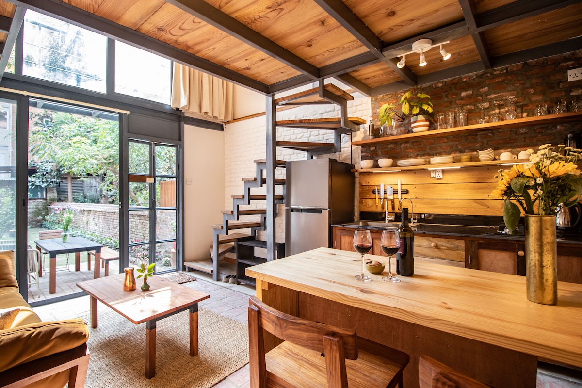 Tucked within an expanded structure but completely independent from the main building. It is a unique, eco-conscious stay built entirely from upcycled materials. It's separate from the main building and offers a calm, thoughtful design. Consists a well-equipped kitchen, a small private garden, and a connected unit with living room, bedroom, and bathroom. Guests also have access to the main building's gorgeous rooftop, which features stunning views on clear days, a small kitchen, and sitting area