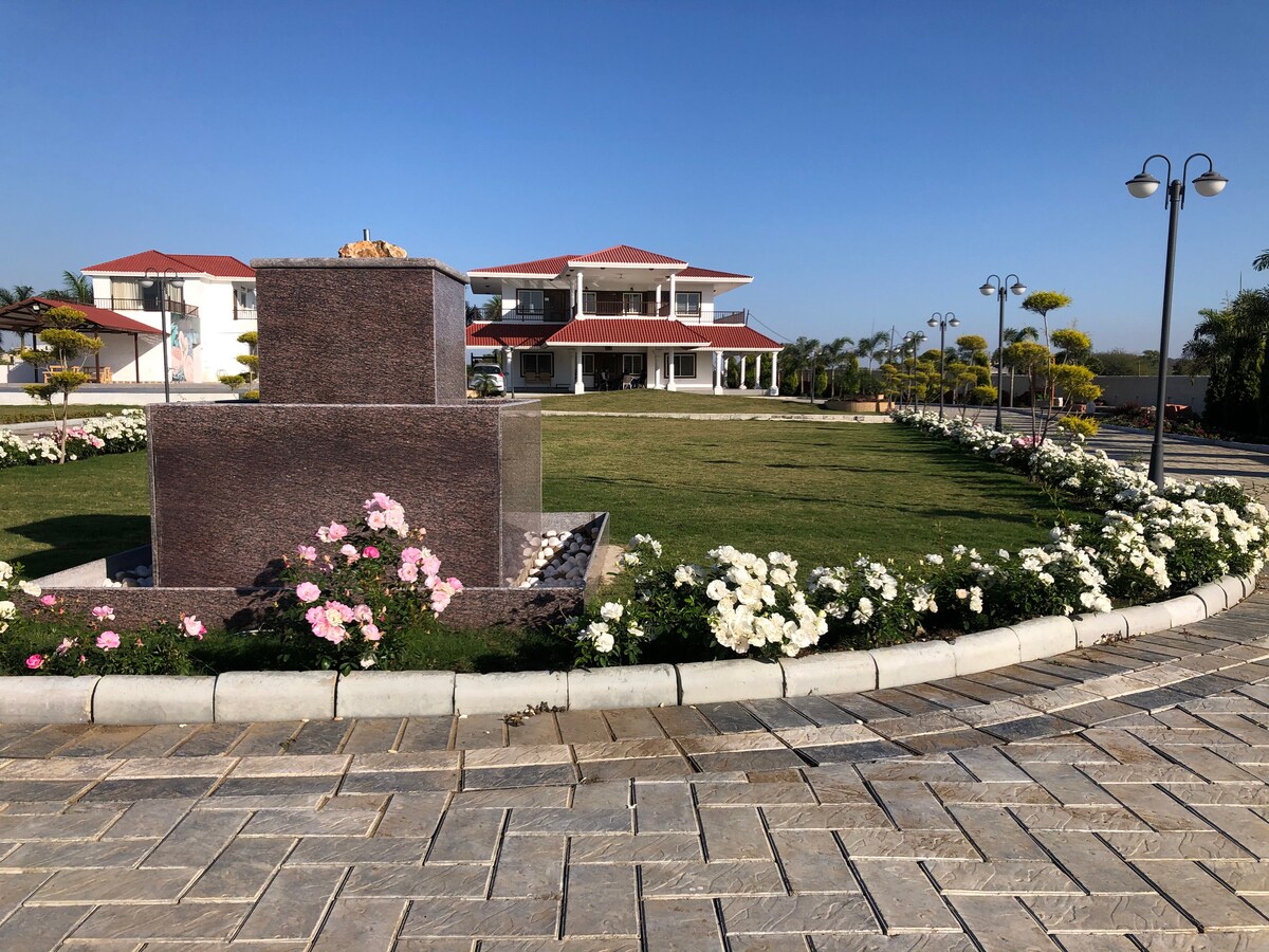Nestled in lush greenery with the palms all around, a swimming pool, a fabulous walkway around the organic vegetation field and fruit orchard, beautiful landscaped lawns, outdoor kids play area, the Panchtatva track, open badminton court, parking space for around 20 cars and the tastefully designed villa are some special features of Sukriti farmvilla. There's a special kids room for the little ones to have fun. We provide freshly cooked vegetarian meals on request. Relax and breathe fresh air!