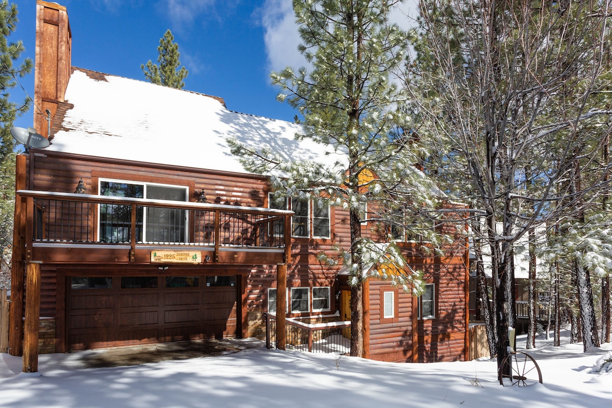 Ova prostrana brvnara sa 4 spavaće sobe je vrhunsko planinsko utočište! Predimenzionirana igraonica krade predstavu sa bazenom, shuffleboard-om, stonim fudbalom i mokrim barom - savršen za porodice i grupe. Opustite se na omotanim terasama s pogledom na padinu, okupite se pored ognjišta ili pustite djecu da se bezbjedno igraju u ograđenom dvorištu. Sa 2 bračne sobe, bračnim krevetom, sobom na sprat i modernom kuhinjom, svega nekoliko minuta vas dijeli od Snow Summita, Bear Mountain i The Village. • Soba za igre • Ognjište • Pogled na planine