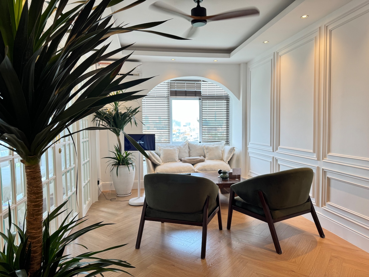 Fully furnished retro apartment in city center. Splendid for couple's getaway or a comfortable space for a group of friends. • 5 min walk to City Hall & Ben Thanh Market, 9 min to Notre Dame Cathedral • Features 3 beds, spacious bathroom with shower, full kitchen Amenities: o Smart TV with Netflix o front-loader washer o toilet w/ bidet o hotel-quality beds o Marshall speaker o fully-stocked coffee bar